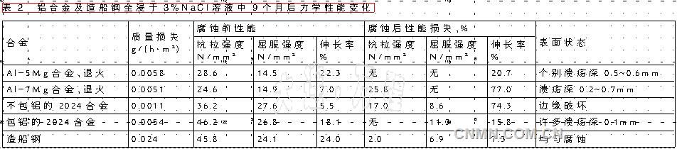 5XXX系合金、2024合金和造船鋼全浸于3%NaCl溶液中9個月后力學性能變化見表2,鋁-鎂合金的抗蝕性比硬鋁2024合金及造船鋼的強得多,不但質量損失很少,而且力學性能損失小,這說明以鋁-鎂合金制造船體有明顯的優越性。