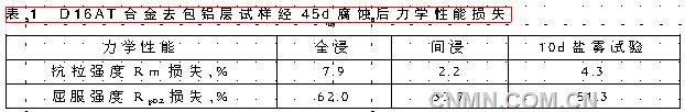 硬鋁的抗蝕性比較低,主要是因為含Cu。有人在一艘硬鋁殼艇上用掛片試驗16天后,發生了十分嚴重的點腐蝕。蘇聯學者用D16AT合金去包鋁層后試樣試驗45天后,其強度的損失見表1,屈服強服Rp0.2的損失成為顯著。