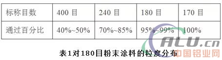 適合靜電噴涂的粉末涂料,其顆粒度最好在10μm到90μm之間(即>170目)。粒度小于10μm的粉末稱超細(xì)粉末,它很容易損耗在大氣中,超細(xì)粉的含量不能太多。這里值得注意的是,粉末的顆粒度和涂膜的厚度有關(guān),對(duì)粉末涂料的顆粒度要有一定的分布范圍(表1)才能得到厚度均勻的涂膜。如要求涂膜的厚度是25μm,則粉末涂料的最大顆粒不能超過65μm,(200目——240目),而大部分粉末都應(yīng)通過35μm(350目——400目)。為了控制和調(diào)整粉末顆粒的大小在粉碎設(shè)備上應(yīng)能加以調(diào)整。對(duì)我國(guó)的粉末制造廠來講,當(dāng)前還做不到這一點(diǎn)。